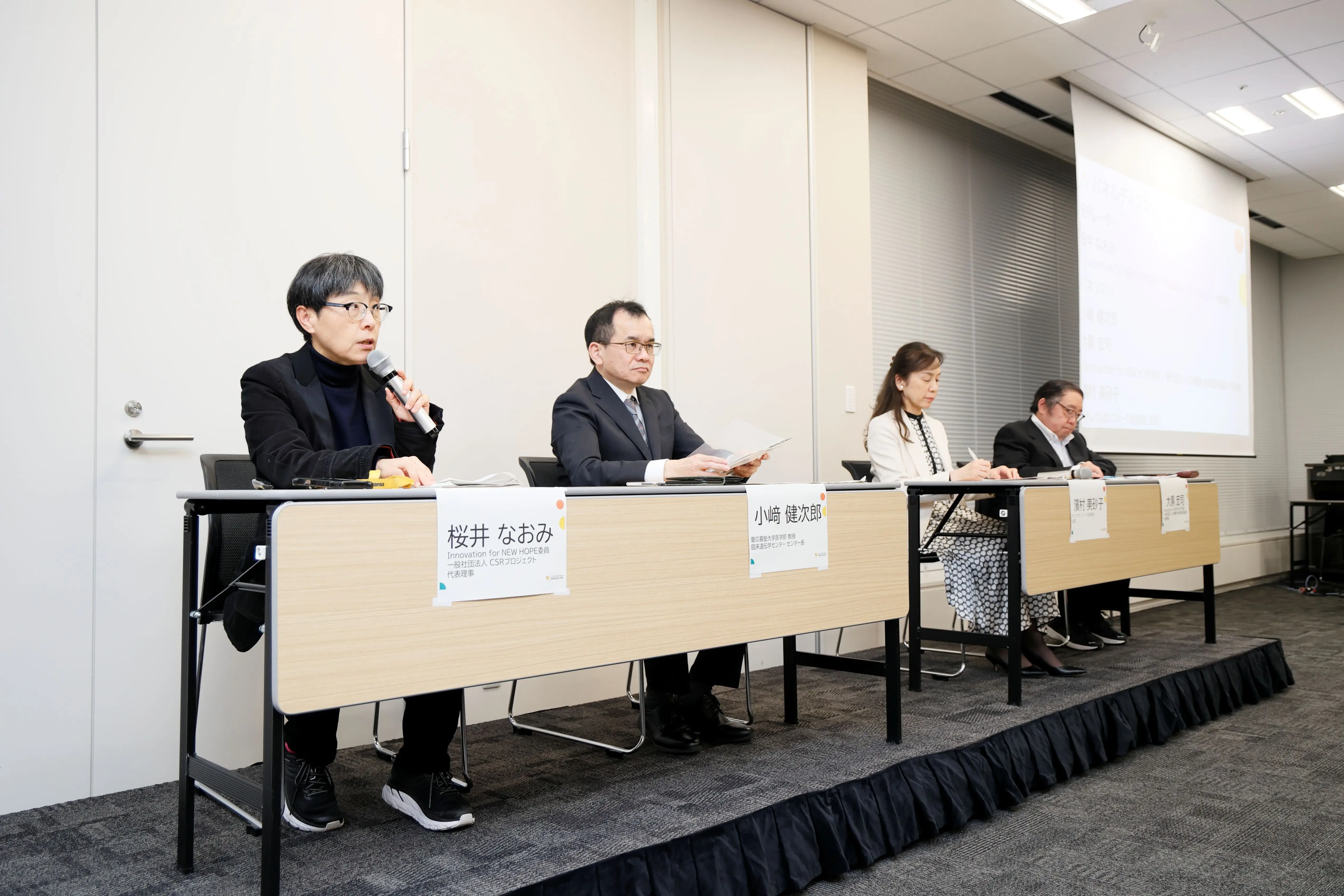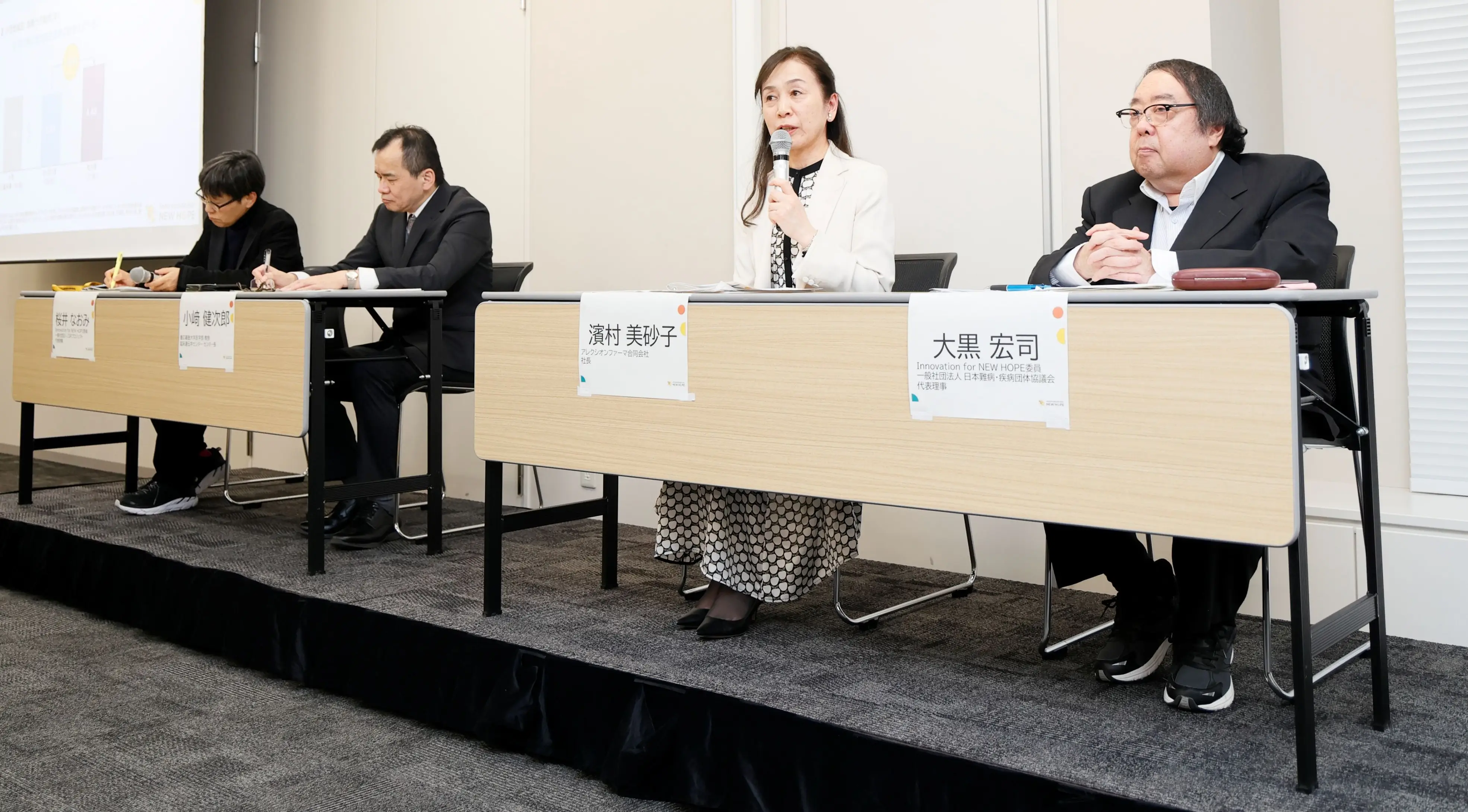 パネルディスカッションでは、CSRプロジェクト代表理事・IfNH委員である桜井 なおみ氏をモデレーターに、講演1演者の小﨑氏、一般社団法人 日本難病・疾病団体協議会 (以下、JPA) 代表理事・IfNH委員である大黒 宏司氏、及びアレクシオンファーマ合同会社(以下、アレクシオン)社長の濱村 美砂子氏が参加し、議論が交わされました。