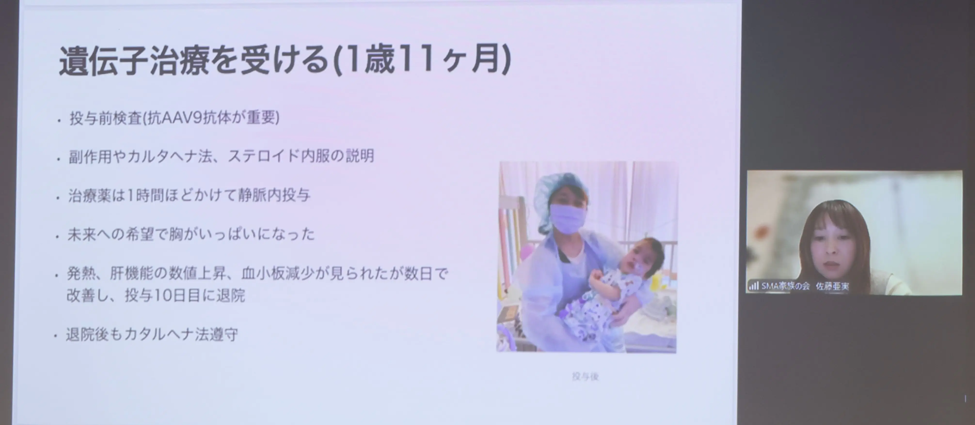 続いて佐藤氏からは、5年前にご子息が遺伝子治療を受けた具体的な経験が語られました。出生直後から呼吸障害があり、新生児集中治療室に入院したものの、原因が分からず、不安な日々を過ごされたこと、生後4週5日目に遺伝子検査でSMAと診断され、核酸医薬で呼吸状態が改善するも、肺炎を機に気管切開を必要となったことなど、治療を開始した当時のご子息のケアの詳細や、治療後のリハビリ、フォローアップの必要性についても言及いただきました。治療から5年後の今は、人工呼吸器を外して遊びや活動に参加できるまで回復されていますが、「もし生まれてすぐに診断され、あと2〜3週間早く治療ができていたら気管切開にはならなかったかもしれない」との率直な思いを述べられ、早期診断・早期治療の重要性を訴えられました。