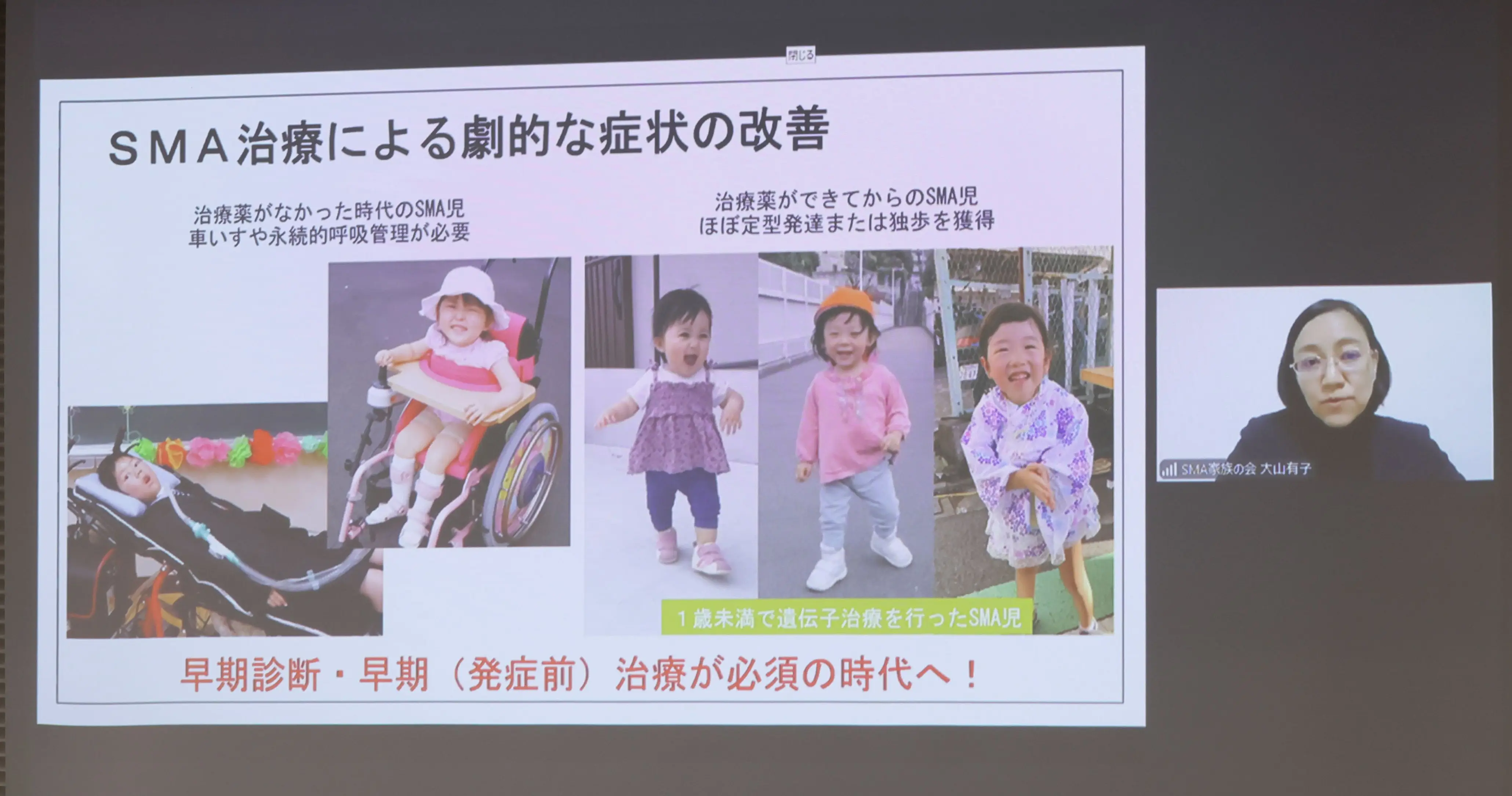 最初に大山氏より、SMAは進行性の希少疾患であり、重症型の生後2歳未満の死亡率が約90%と高いことが紹介されました。一方、2017年以降は核酸医薬、遺伝子治療薬などの革新的新薬が登場し、症状の劇的な改善が可能になったため、早期診断・早期治療が必須の時代になったと説明。患者会として、新薬承認や新生児マススクリーニングの公費化に向けた活動についてお話しいただきました。